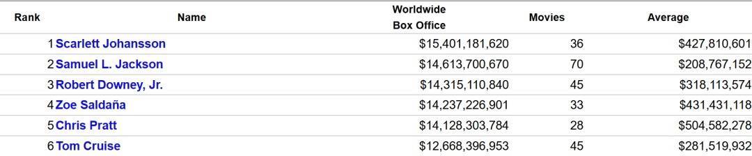 今年7月,据电影数据网站TheNumber的统计数据,阿汤哥成为全球票房最高的演员排行榜第6,仅次于“寡姐”斯嘉丽·约翰逊(ScarlettJohansson)、塞缪尔·L·杰克逊(SamuelL.Jackson)、小罗伯特·唐尼(RobertDowneyJr.)等经常出演漫威电影的好莱坞演员。